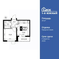 Продаётся 1-к квартира номер 450 общей площадью 34.4 кв.м. на 11-м этаже 24 этажного здания. Предчистовая отделка.