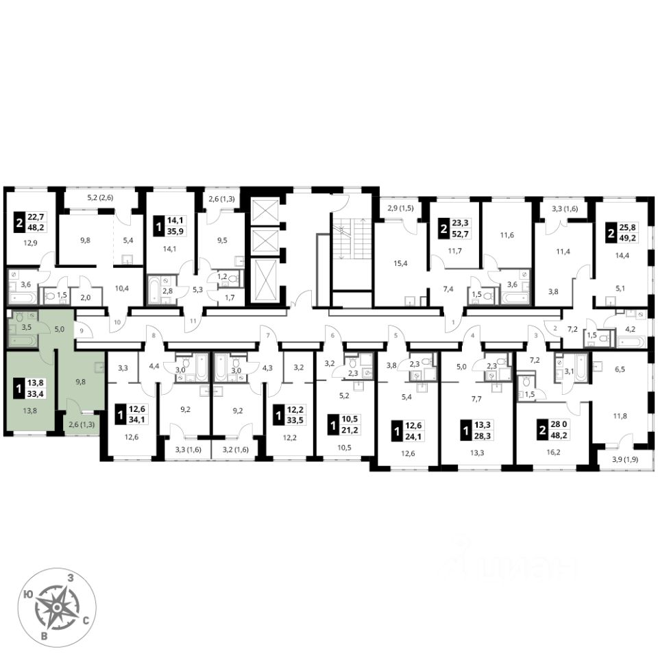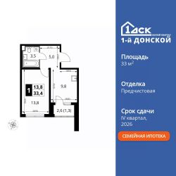 Продаётся 1-к квартира номер 492 общей площадью 33.4 кв.м. на 2-м этаже 24 этажного здания. Предчистовая отделка.