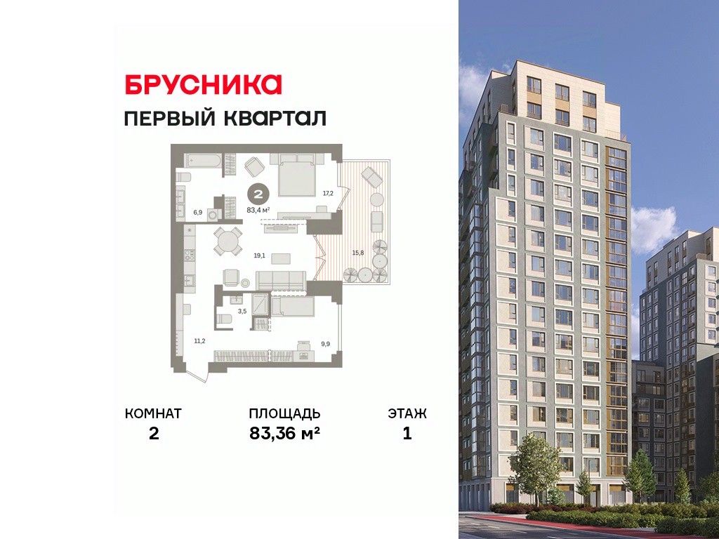 Квартира с кухней-гостиной и двумя спальнями в "Первом квартале". Особенности планировки: вид во двор, мастер-спальня, окна в пол, панорамное остекление, потолки 3 м и выше, разнесённые спальни, свободная планировка, терраса.
