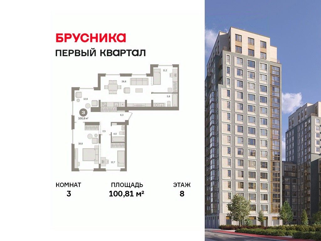 Квартира с кухней-гостиной и тремя спальнями в "Первом квартале". Особенности планировки: вид во двор, второй санузел, гардеробная, мастер-спальня, окно в коридоре, разнесённые спальни, свободная планировка.