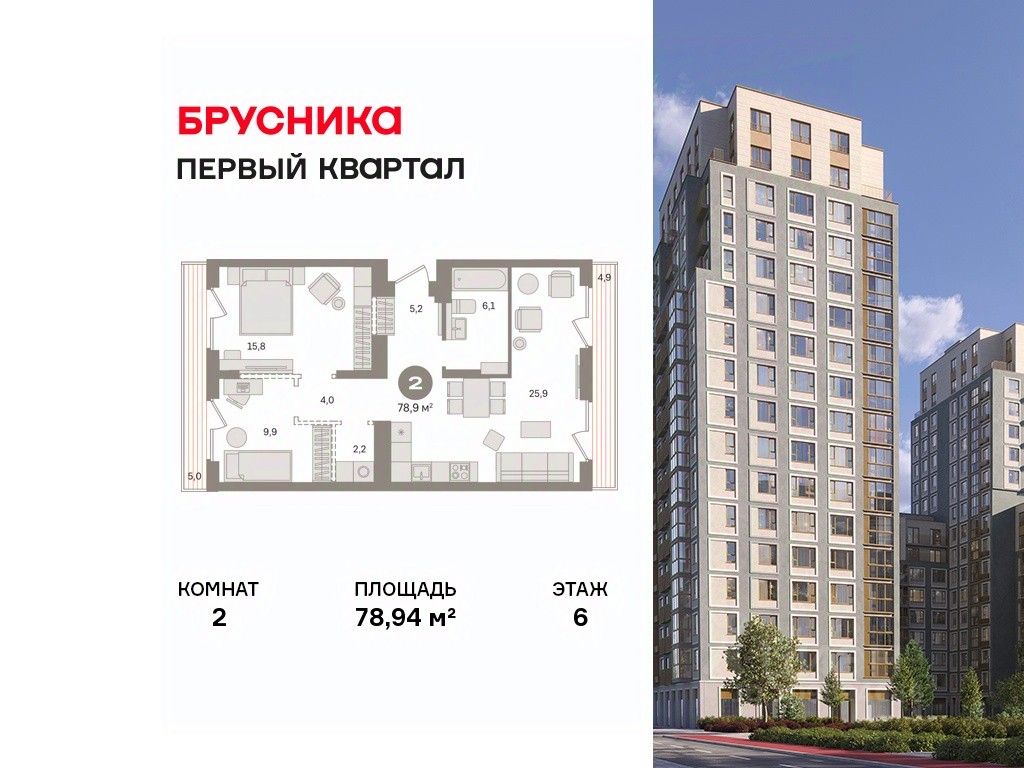 Квартира с кухней-гостиной и двумя спальнями в "Первом квартале". Особенности планировки: вид во двор, окна на две стороны, постирочная, свободная планировка, терраса.