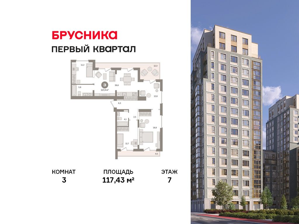Квартира с кухней-гостиной и тремя спальнями в "Первом квартале". Особенности планировки: вид во двор, второй санузел, гардеробная, мастер-спальня, окно в коридоре, разнесённые спальни, свободная планировка, терраса.