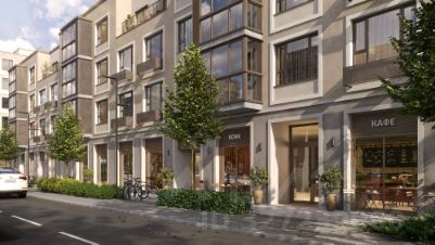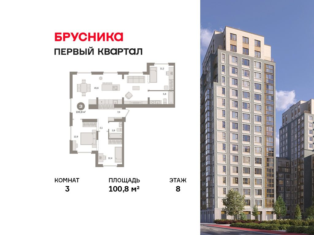Квартира с кухней-гостиной и тремя спальнями в "Первом квартале". Особенности планировки: вид во двор, второй санузел, гардеробная, мастер-спальня, разнесённые спальни, свободная планировка.
