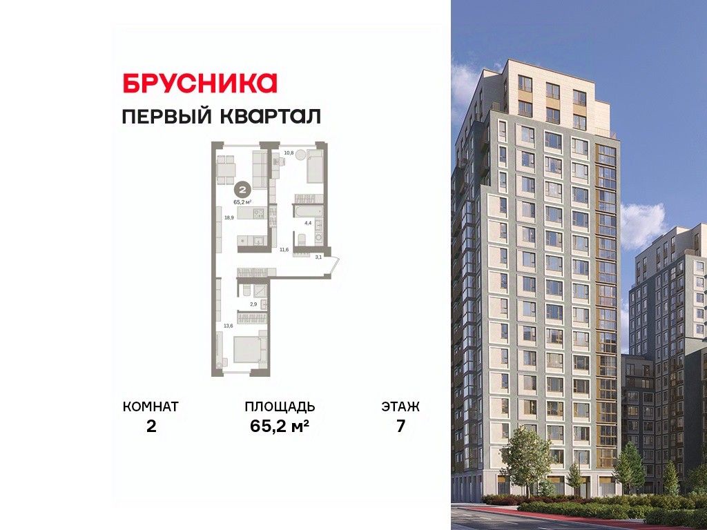 Квартира с кухней-гостиной и двумя спальнями в "Первом квартале". Особенности планировки: вид во двор, второй санузел, мастер-спальня, окна на две стороны, предчистовая отделка, разнесённые спальни.
