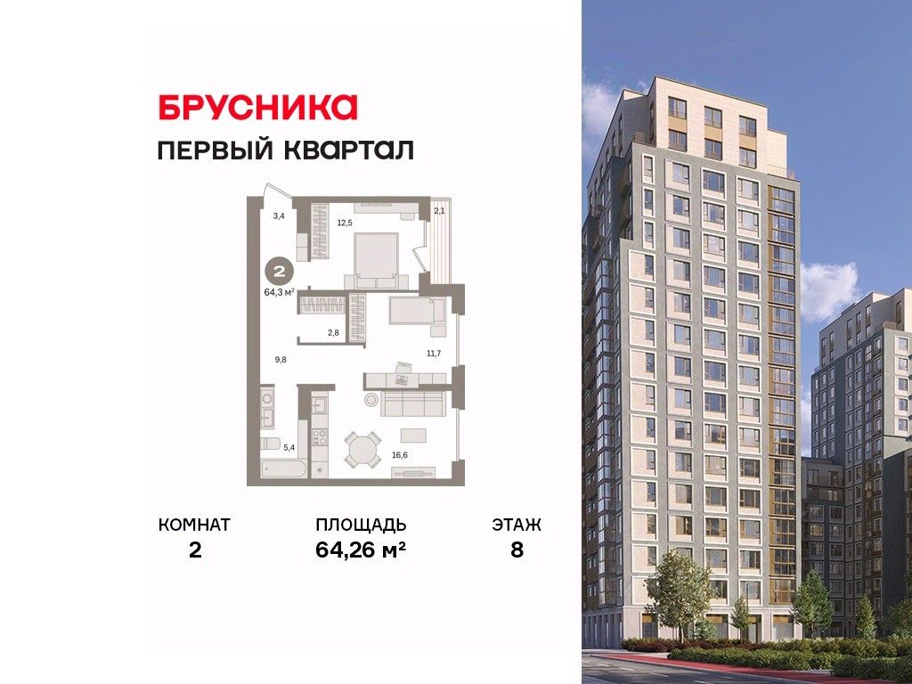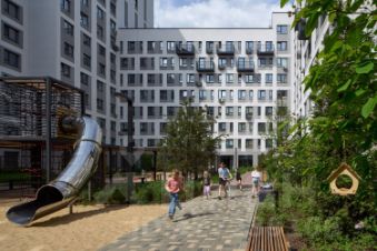 Квартира с кухней-гостиной и двумя спальнями в "Первом квартале". Особенности планировки: вид во двор, гардеробная, предчистовая отделка, терраса.