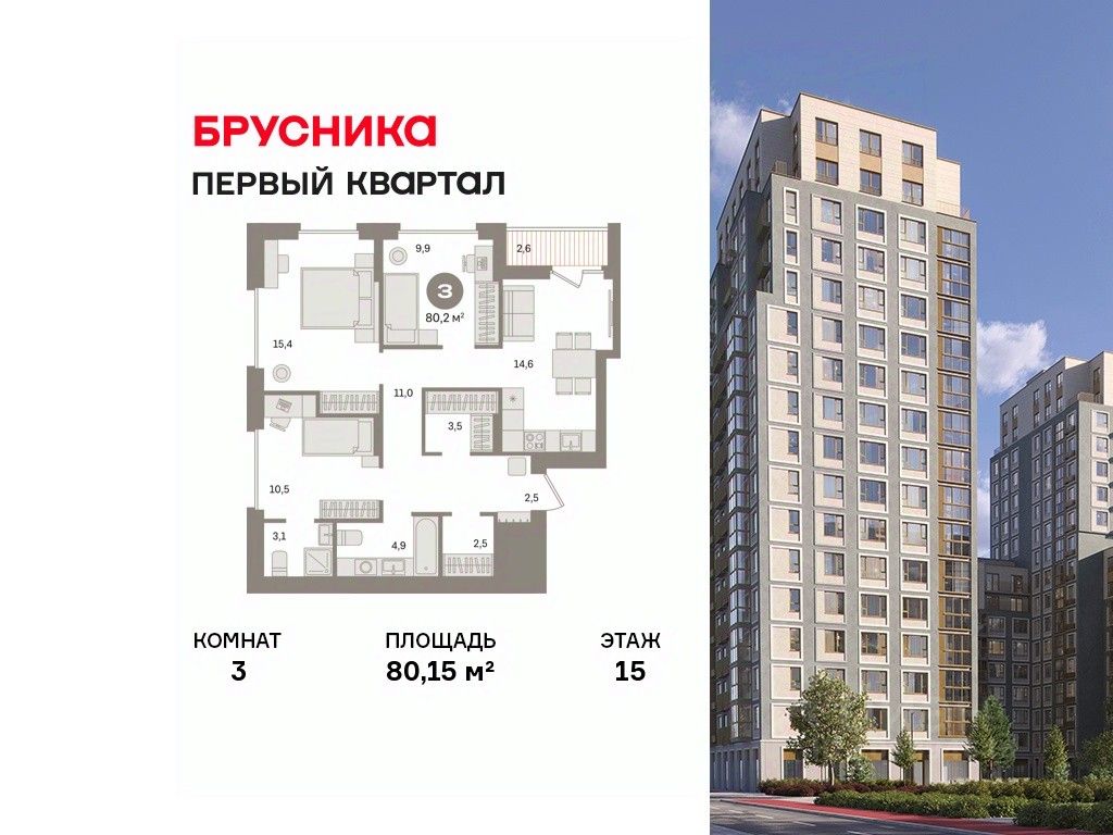 Квартира с кухней-гостиной и тремя спальнями в "Первом квартале". Особенности планировки: второй санузел, гардеробная, лоджия, мастер-спальня, постирочная, предчистовая отделка.
