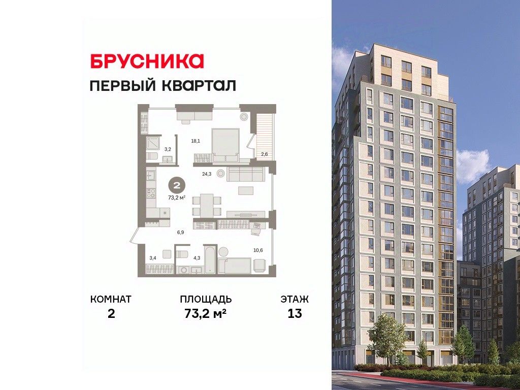Квартира с кухней-гостиной и двумя спальнями в "Первом квартале". Особенности планировки: вид во двор, гардеробная, лоджия, мастер-спальня, предчистовая отделка, разнесённые спальни.