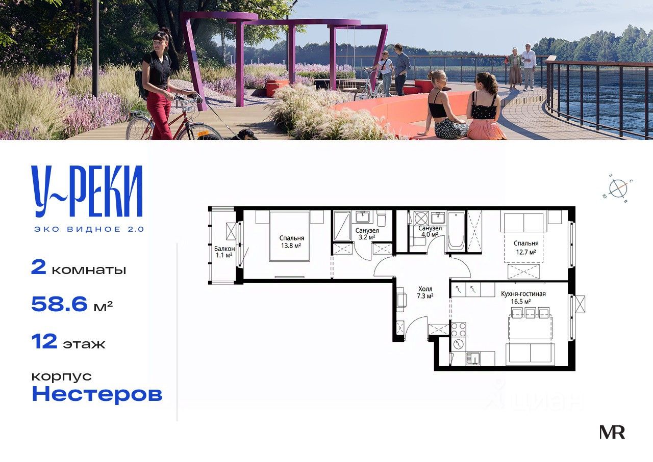Продаётся 2-комнатная квартира общей площадью 58.60 м² с предчистовой отделкой в ЖК "У реки. Эко Видное 2.0" на 12-м этаже корпуса Нестеров.