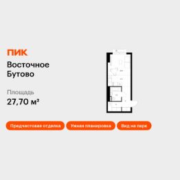 Продаётся квартира-студия площадью 27,7 кв.м на 13 этаже 15 этажного дома (Корпус 48, Секция 3) проекта ПИК Восточное Бутово. Светлый просторный подъезд на уровне земли, функциональная планировка, большие окна, предчистовая отделка.
