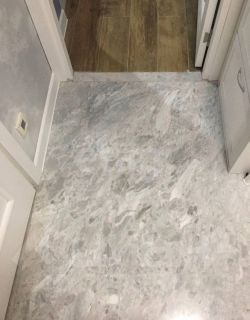 • керамогранит+теплый пол на кухне и в санузле, слэб из мрамора в коридоре.