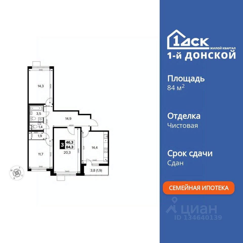 Продаётся 3-к квартира номер 118 общей площадью 84.3 кв.м. на 18-м этаже 24 этажного здания. Чистовая отделка. Цена с учётом скидки.