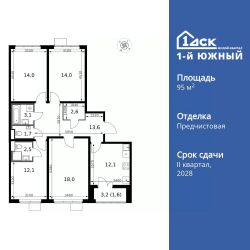 Продаётся 4-к квартира номер 227 общей площадью 95.3 кв.м. на 9-м этаже 24 этажного здания. Предчистовая отделка. Цена с учётом скидки.