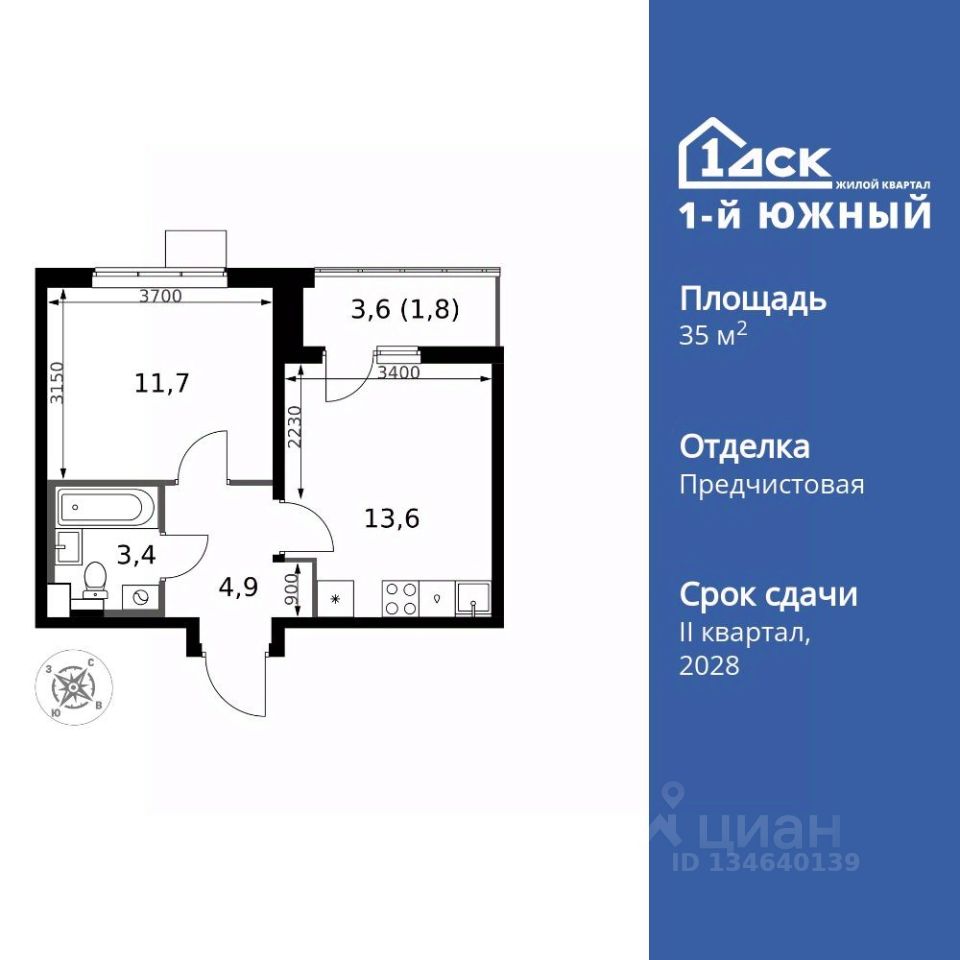 Продаётся 1-к квартира номер 232 общей площадью 35.4 кв.м. на 10-м этаже 24 этажного здания. Предчистовая отделка. Цена с учётом скидки.