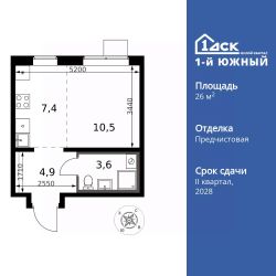 Продаётся квартира-студия номер 783 общей площадью 26.4 кв.м. на 10-м этаже 25 этажного здания. Предчистовая отделка. Цена с учётом скидки.