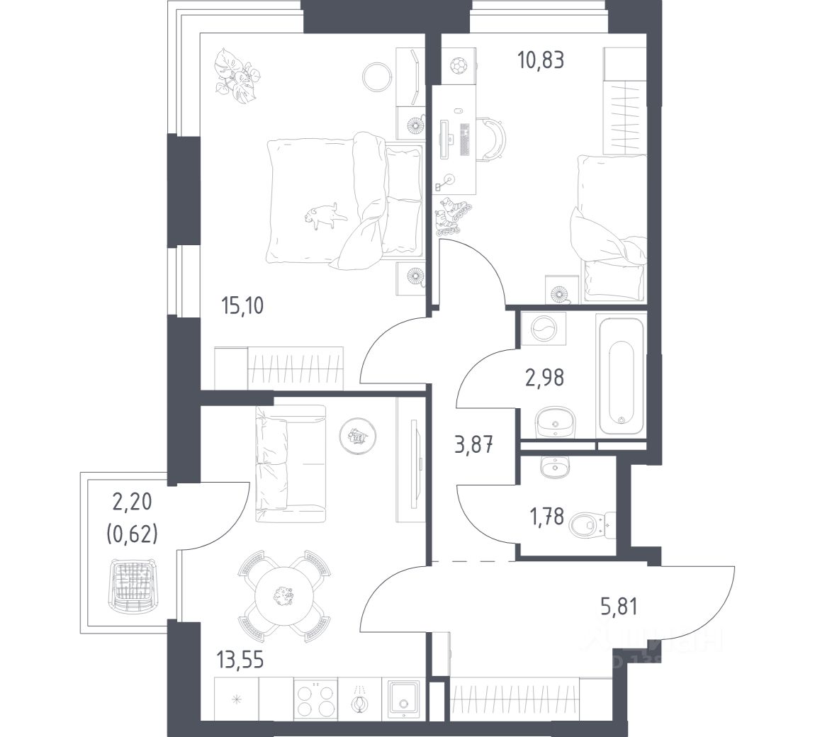 Строим кварталы для жизни с заботой о будущем. Предлагается 2-комнатная квартира комфорт-класса площадью 54,54 кв.м в корпусе 7.3 на 8-м этаже, в жилом комплексе "Богдановский Лес".