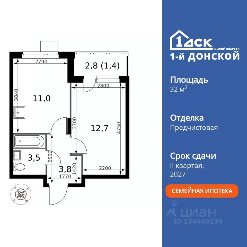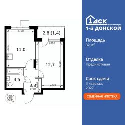 Продаётся 1-к квартира номер 487 общей площадью 32.4 кв.м. на 21-м этаже 24 этажного здания. Предчистовая отделка.