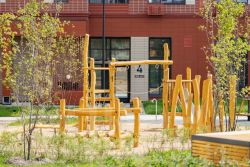 "1-й Донской": продуманная среда в развивающемся районе. На территории - муниципальные школа и 2 детских сада, поликлиника, торговый центр с площадью для мероприятий. Сеть пешеходных маршрутов ведёт к магазинам и кафе, отделённым от дорог зелёными фито-стенами.