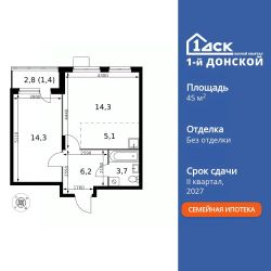 Продаётся 2-к квартира номер 632 общей площадью 45 кв.м. на 11-м этаже 24 этажного здания. Без отделки.