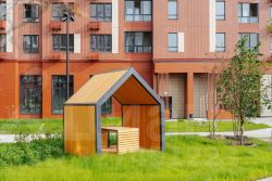 "1-й Донской": продуманная среда в развивающемся районе. На территории - муниципальные школа и 2 детских сада, поликлиника, торговый центр с площадью для мероприятий. Сеть пешеходных маршрутов ведёт к магазинам и кафе, отделённым от дорог зелёными фито-стенами.