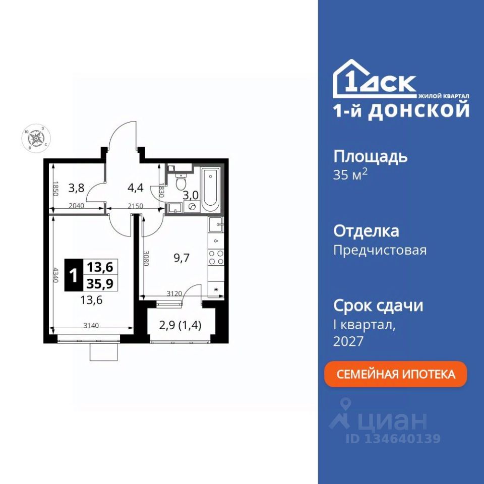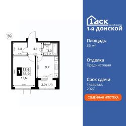 Продаётся 1-к квартира номер 644 общей площадью 35.9 кв.м. на 19-м этаже 24 этажного здания. Предчистовая отделка.