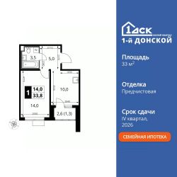 Продаётся 1-к квартира номер 613 общей площадью 33.8 кв.м. на 13-м этаже 24 этажного здания. Предчистовая отделка.