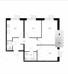 -три комнаты просторные комнаты- 12,9, 11,9 и 16,9м2- большая кухня с мебелью и техникой 12,6м2