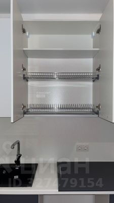 Площадь кухни-гостиной составляет 12.6 кв. м, что позволяет комфортно разместить обеденную зону и мягкую мебель. В помещении установлена современная угловая кухня с техникой (холодильник, предусмотрены места для плиты, духового шкафа и посудомоечной машины), мойка и смеситель черного цвета, а также продуманная система хранения со множеством шкафов.