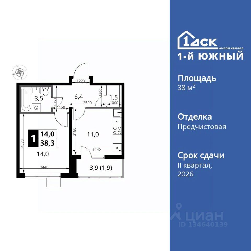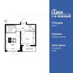 Продаётся 1-к квартира номер 325 общей площадью 38.3 кв.м. на 18-м этаже 25 этажного здания. Предчистовая отделка.
