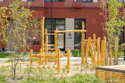 "1-й Донской": продуманная среда в развивающемся районе. На территории - муниципальные школа и 2 детских сада, поликлиника, торговый центр с площадью для мероприятий. Сеть пешеходных маршрутов ведёт к магазинам и кафе, отделённым от дорог зелёными фито-стенами.