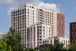 ЖК "1-й Донской" в 7 км от МКАД: гармония городского комфорта и природы. Квартиры на 2-3 стороны света, форма секций и разная этажность создают динамичную архитектуру. Тёплая палитра фасадов и подсветка подчеркивают образ.
