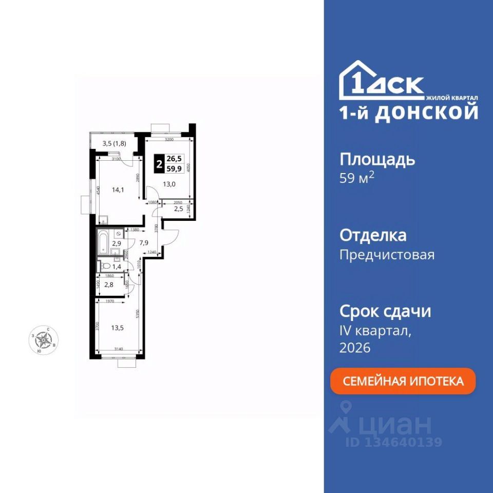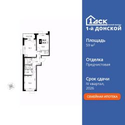 Продаётся 2-к квартира номер 445 общей площадью 59.9 кв.м. на 21-м этаже 24 этажного здания. Предчистовая отделка.