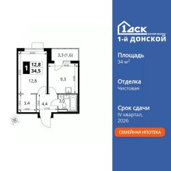 Продаётся 1-к квартира номер 358 общей площадью 34.5 кв.м. на 12-м этаже 24 этажного здания. Чистовая отделка.