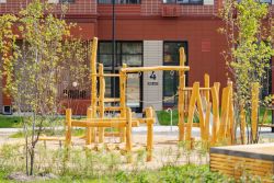 "1-й Донской": продуманная среда в развивающемся районе. На территории - муниципальные школа и 2 детских сада, поликлиника, торговый центр с площадью для мероприятий. Сеть пешеходных маршрутов ведёт к магазинам и кафе, отделённым от дорог зелёными фито-стенами.