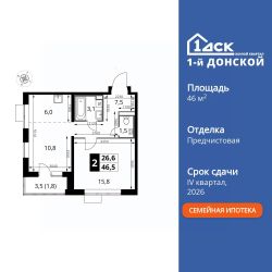 Продаётся 2-к квартира номер 752 общей площадью 46.5 кв.м. на 3-м этаже 24 этажного здания. Предчистовая отделка.