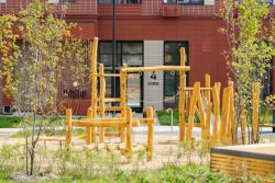 "1-й Донской": продуманная среда в развивающемся районе. На территории - муниципальные школа и 2 детских сада, поликлиника, торговый центр с площадью для мероприятий. Сеть пешеходных маршрутов ведёт к магазинам и кафе, отделённым от дорог зелёными фито-стенами.