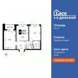 Продаётся 2-к квартира номер 899 общей площадью 55.3 кв.м. на 20-м этаже 24 этажного здания. Предчистовая отделка.