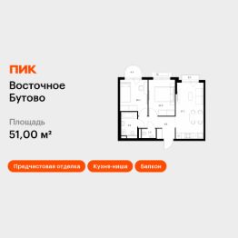 Продаётся 2-комн. квартира площадью 51 кв.м на 5 этаже 25 этажного дома (Корпус 48, Секция 4) проекта ПИК Восточное Бутово. Светлый просторный подъезд на уровне земли, функциональная планировка, большие окна, предчистовая отделка.