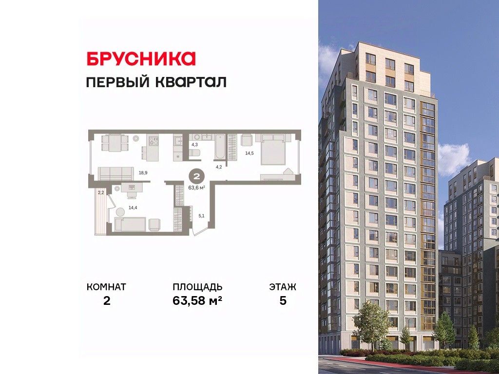 Квартира с кухней-гостиной и двумя спальнями в "Первом квартале". Особенности планировки: вид во двор, гардеробная, мастер-спальня, новые лоты, окна на две стороны, предчистовая отделка, разнесённые спальни, терраса на крыше.