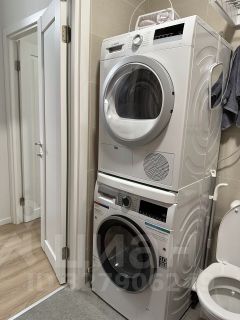 Санузел совмещенный, оформлен в современном стиле : подключены стиральная и сушильная машины BOSH.