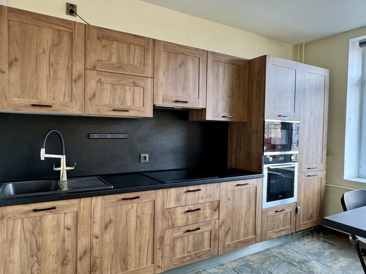 Кухня оснащена современной встроенной техникой. Организовано много мест для хранения. Установлена система теплых полов, система защиты от протечек воды.