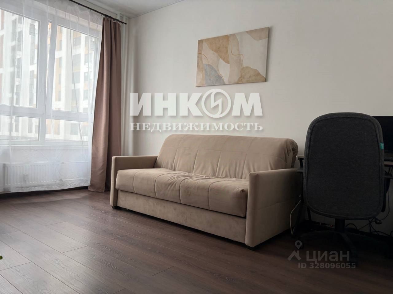 Общая площадь, без учета лоджии - 36,3 метра. Просторная комната, кухня правильной квадратной формы, с выходом на застеклённую лоджию. Есть гардеробная комната. Вид из окон во двор.