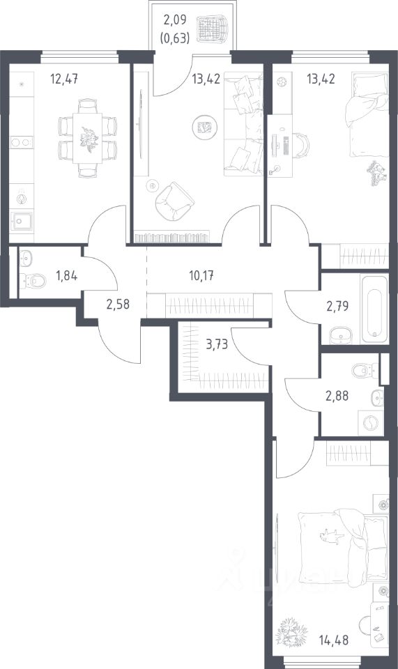 Продаётся 3-комнатная квартира в строящемся доме (Корпус 8.1), срок сдачи: III-кв. 2026, общей площадью 78.41 кв.м., на 7 этаже. Расположение, транспортная доступность