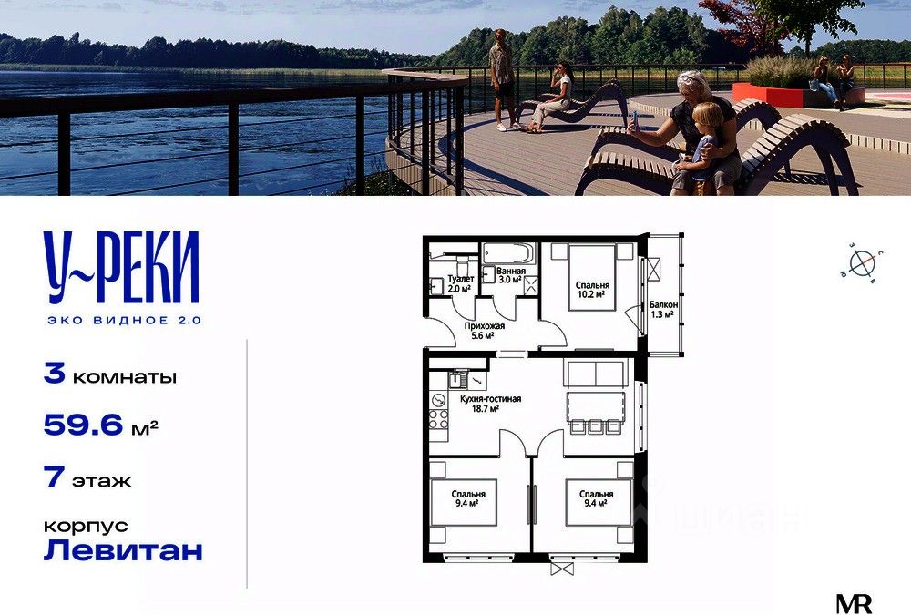 Продаётся 3-комнатная квартира общей площадью 59.60 м² без отделки в ЖК "У реки. Эко Видное 2.0" на 7-м этаже 17 этажного корпуса Левитан.
