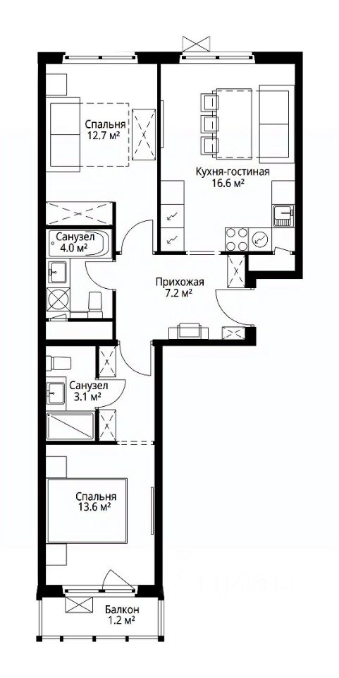 Продаётся 2-комнатная квартира общей площадью 58.40 м² без отделки в ЖК "У реки. Эко Видное 2.0" на 15-м этаже 17 этажного корпуса Левитан.