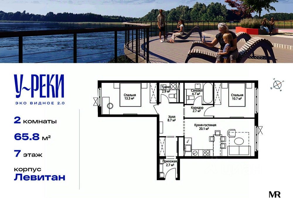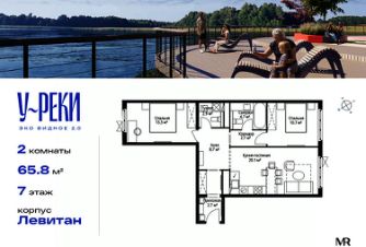 Продаётся 2-комнатная квартира общей площадью 65.80 м² без отделки в ЖК "У реки. Эко Видное 2.0" на 7-м этаже 17 этажного корпуса Левитан.