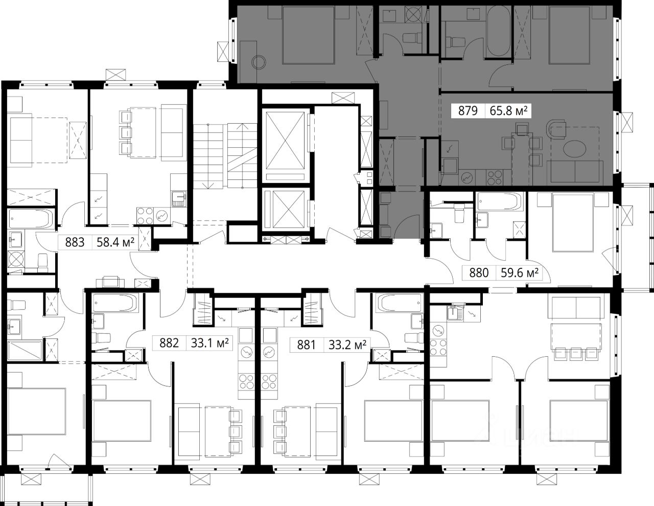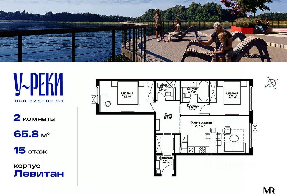Продаётся 2-комнатная квартира общей площадью 65.80 м² без отделки в ЖК "У реки. Эко Видное 2.0" на 15-м этаже 17 этажного корпуса Левитан.