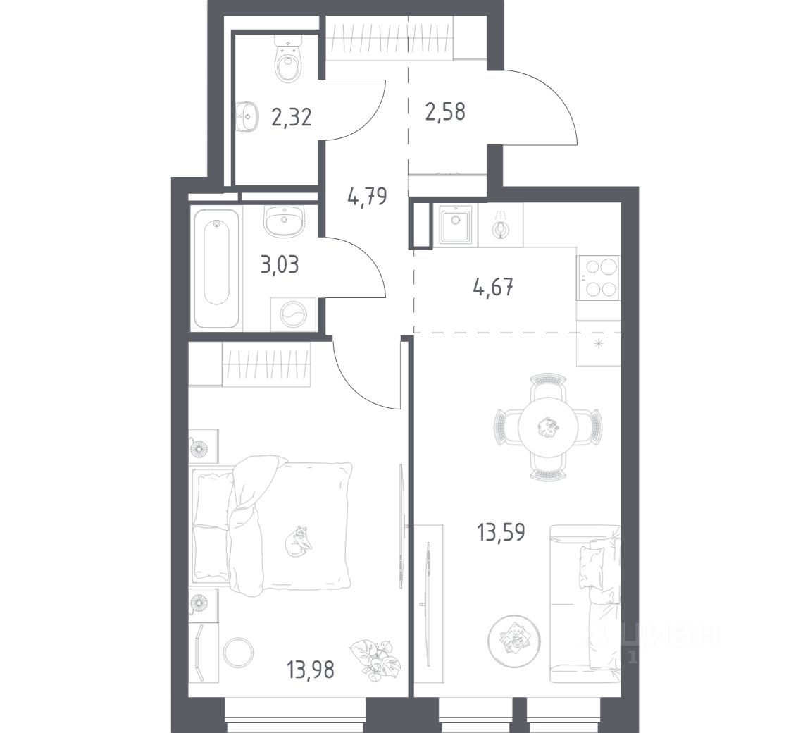 Строим кварталы для жизни с заботой о будущем. Предлагается 1-комнатная квартира комфорт-класса площадью 44,96 кв.м в корпусе 7.2 на 3-м этаже, в жилом комплексе "Богдановский Лес".