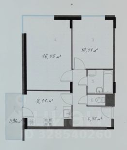 - Общая площадь: 46,1 кв.м (жилая — 26,86 кв.м, кухня — 8,11 кв м, коридор — 6,96 кв.м, балкон — 3,96 кв.м).