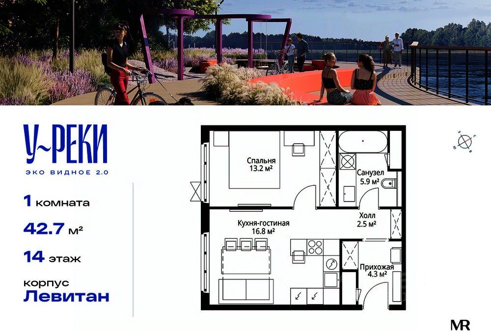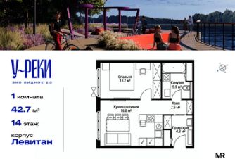 Продаётся 1-комнатная квартира общей площадью 42.70 м² с чистовой отделкой в ЖК "У реки. Эко Видное 2.0" на 14-м этаже 17 этажного корпуса Левитан.