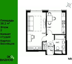 Продаётся студия общей площадью 38.20 м² с предчистовой отделкой в ЖК "У реки. Эко Видное 2.0" на 2-м этаже 17 этажного корпуса Васнецов.